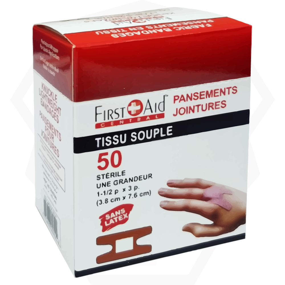Adhesive bandages, sterile, knuckle are designed to provide optimum protection for joints in minor injuries such as cuts and scrapes. These adhesive fabric bandages measure 3.8 cm x 7.6 cm (1 1/2" x 3") and are specially adapted to joint areas.